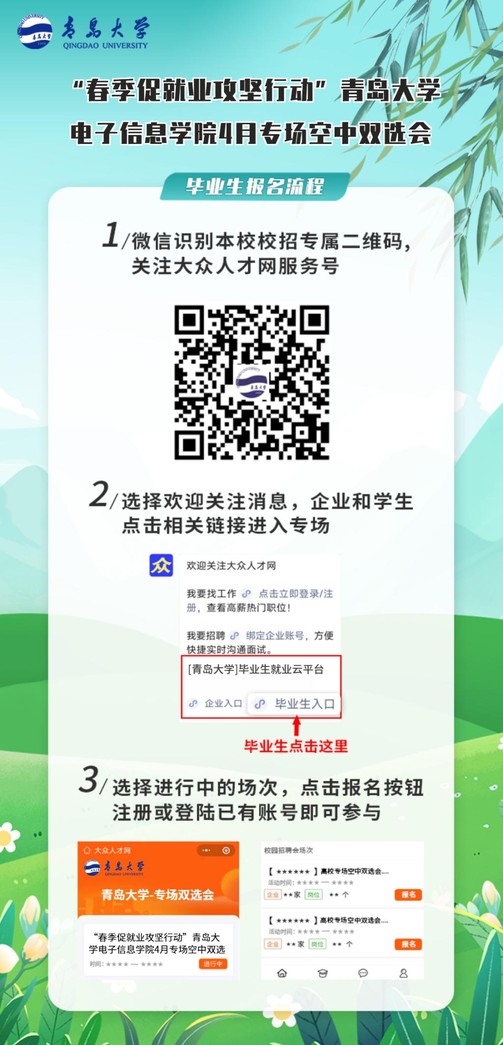 微信报名入口:手机微信扫码关注“大众人才网”微信公众号,企业和毕业生分别点击相关按钮进入青岛大学校招端口,点击本学院报名按钮,注册或登录已有账号即可直接参与。