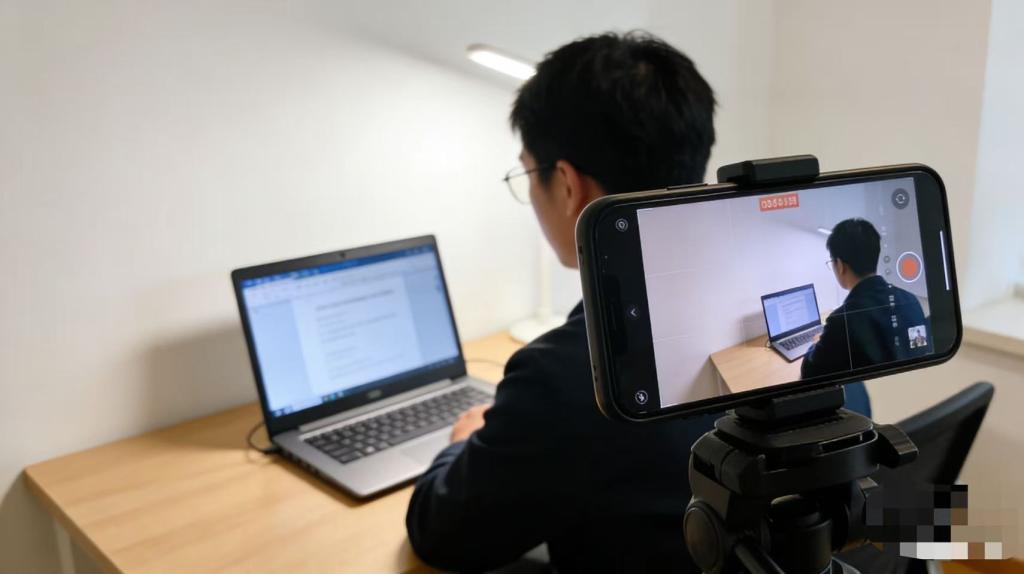 “第二机位”: 用于监控面试环境的设备,建议采用1部手机,位于考生侧后方45度,可查看第一机位及考生所处环境,确保考生考试屏幕能够清晰地被复试专家组成员看到。如下图所示: