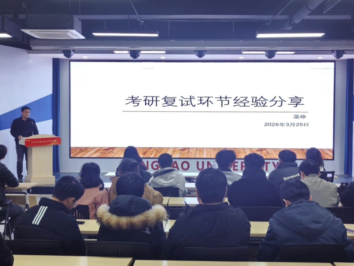 3月25日,我院在泓园科创文化中心二楼多功能厅举办2026届毕业生考研复试、调剂经验分享交流会。本次分享会由温峥教授主讲,毕业生辅导员陈胜发主持会议,教学科研办公室江冬梅老师和考研毕业生到场出席。
